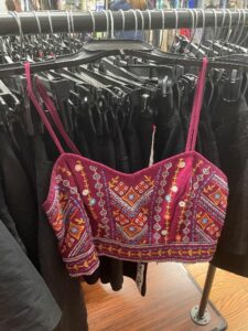 Not only will this Spring be the season of the short skirt, but it will also be the season of the shorter top. Bra tops are back in style. It’s not just the crop top that has been popular for years; now, it’s all about the bra top! I love this bright fuchsia design with colorful embroidery and embellishments. Pair it with one of the black mini-skirts hanging up behind it, and you’re ready for a night out in a super trendy outfit for Spring!